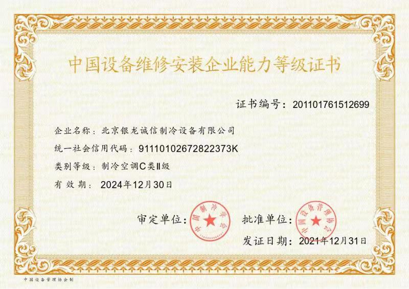 2007年:獲準(zhǔn)成為北京市制冷行業(yè)技術(shù)學(xué)會理事單位; 2009年:獲得北京市大興區(qū)百強企業(yè)認(rèn)證; 2009年:獲得國家高新技術(shù)企業(yè)認(rèn)證; 2011年:獲北京市安全生產(chǎn)先進(jìn)企業(yè)稱號,節(jié)能環(huán)保先進(jìn)單位; 2012年:通過了國家高新技術(shù)企業(yè)復(fù)審; 2013年:公司董事長獲"2013北京先進(jìn)企業(yè)家"榮譽稱號; 2014年:獲2014年度中國冷庫工程安裝設(shè)計造價行業(yè)十大品牌;